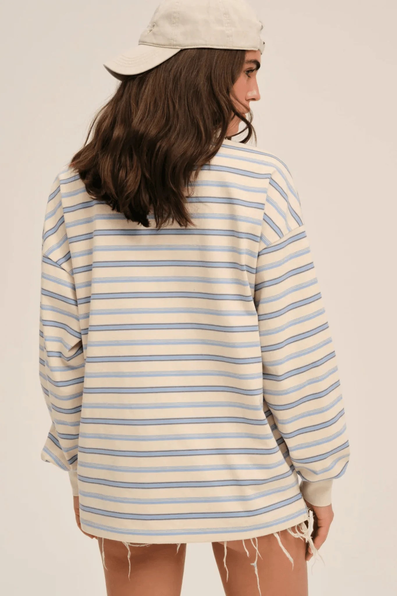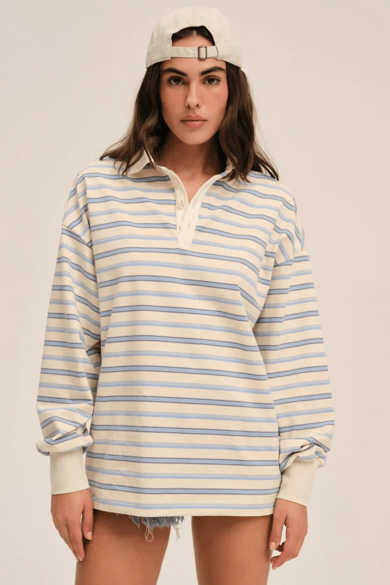 The Ashton Polo Top crafted to blend timeless style and daily comfort. Made with 100% breathable cotton and featuring a fun stripe, perfect for paring all on its own or as a first layer with endless styling possibilities. For an easy day time look style with relaxed denim and your favorite sneakers.