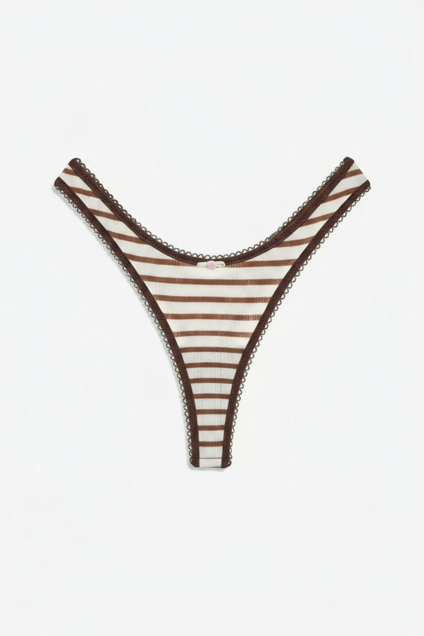 For a look that feels like home, the Bella striped panty was designed for lounging, layering, and everything in between. Crated in a brown and cream stripe, this brown thong spotlights a high-cut leg and is adorned with scalloped picot trims and a rosette at front waist. Pair with the Bella Underwire Bra for the complete lingerie set.
