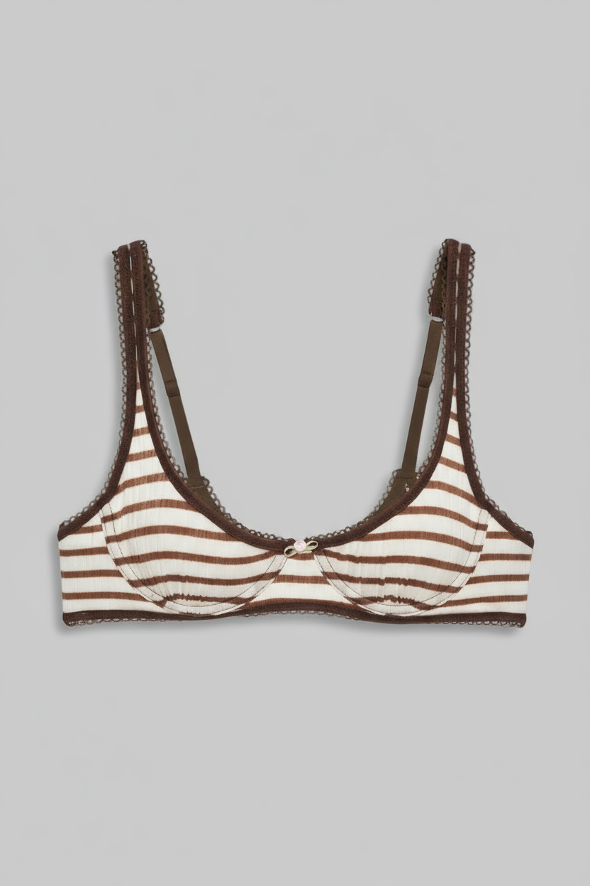 For a look that feels like home, the Bella unlined bra was designed for lounging, layering, and everything in between. Crafted in a brown and cream stripe, this underwire bra spotlights a contoured scooped cup shape and is adorned with scalloped picot trims and a rosette at front. Pair with the Bella Thong Panty for the complete lingerie set.