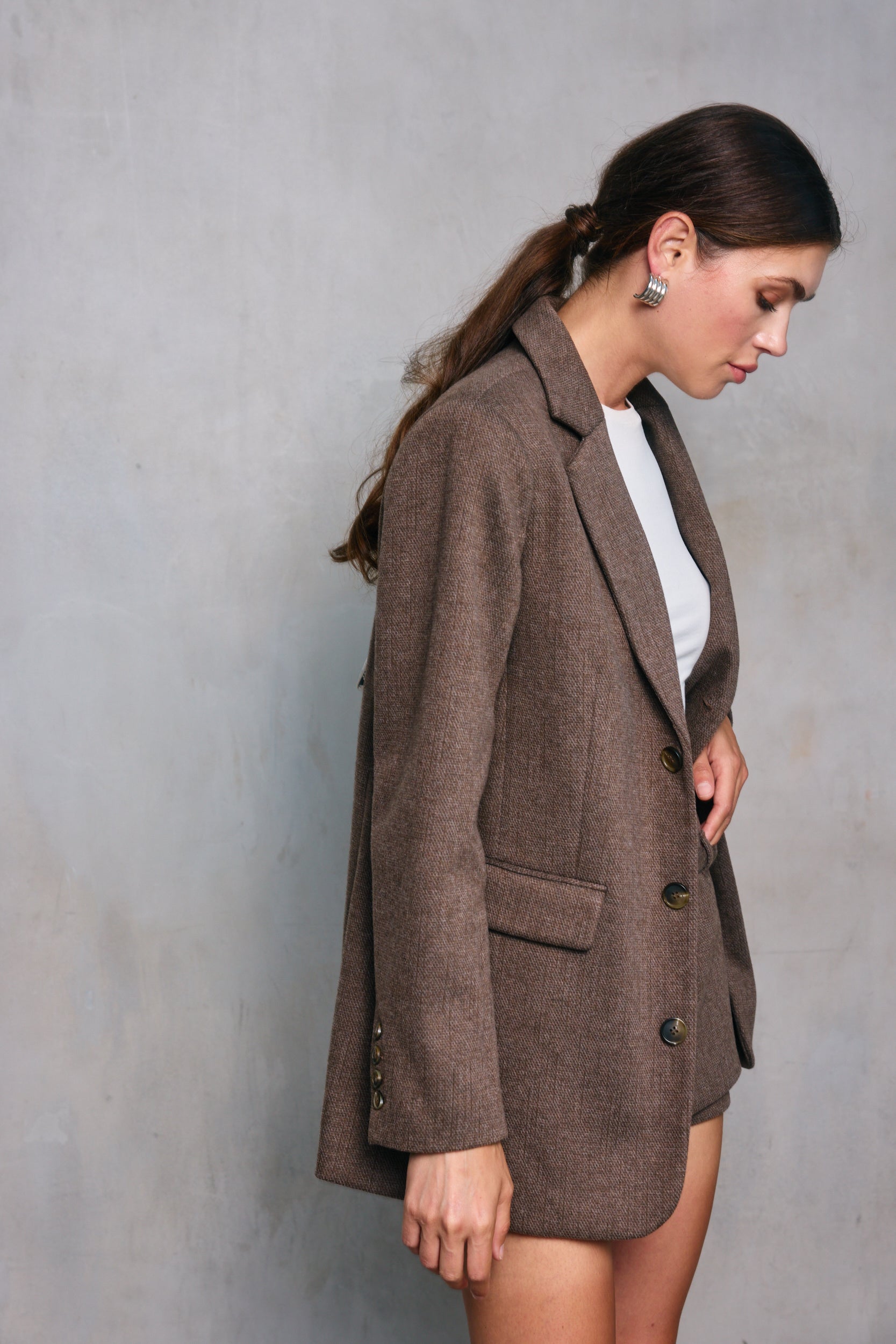 The Belmont Blazer is a sleek single-breasted jacket in a mid-weight brushed suiting fabric, complete with padded shoulders, flap pockets, and a button-front closure.