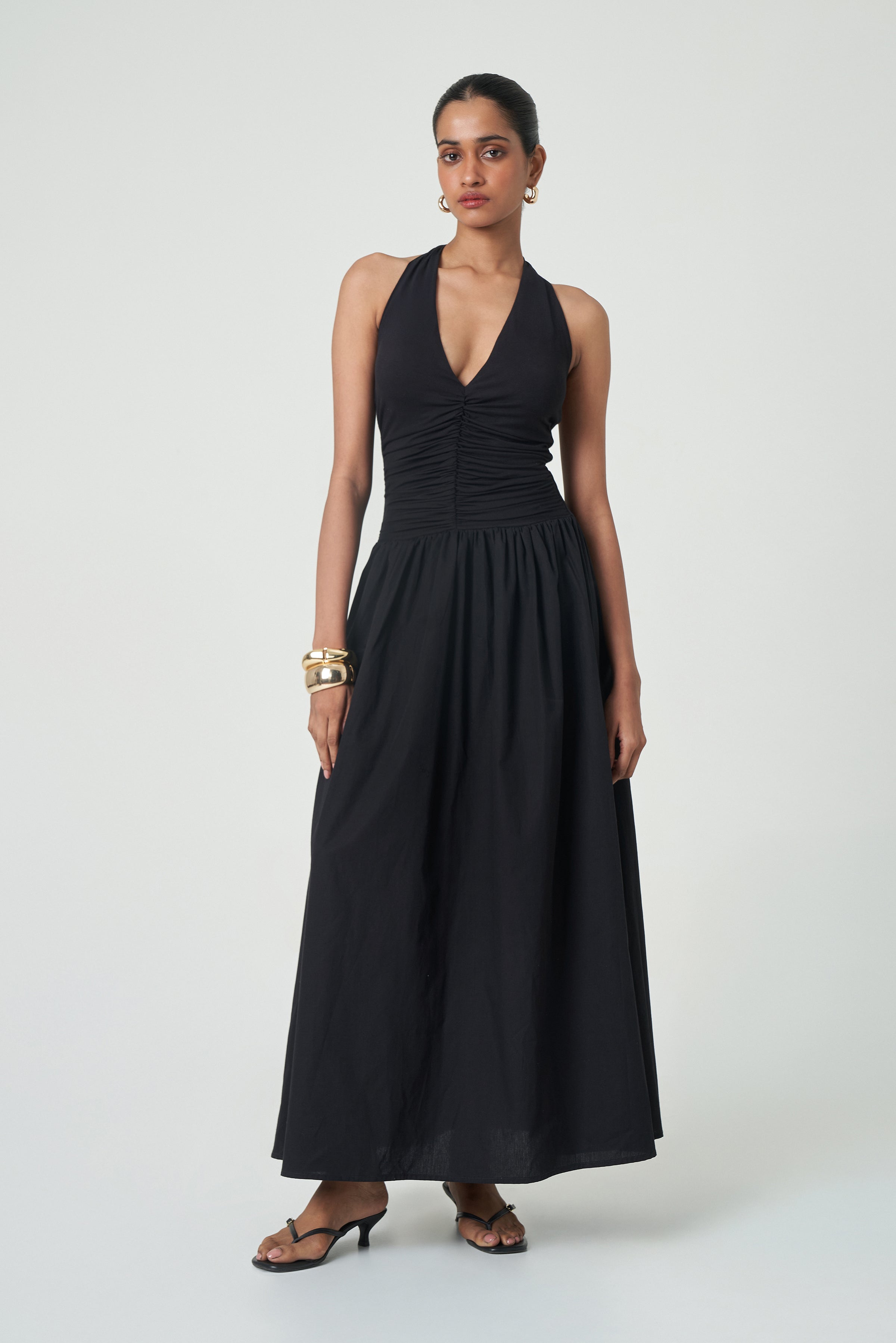The Cannes Dress is a midi-length halter dress with a ruched bodice, a deep V neckline, and a relaxed skirt. It blends a stretchy viscose-elastane top with an organic cotton skirt for contrast and ease. The dress feels elegant yet approachable — a great choice for dressy dinners or special nights out.