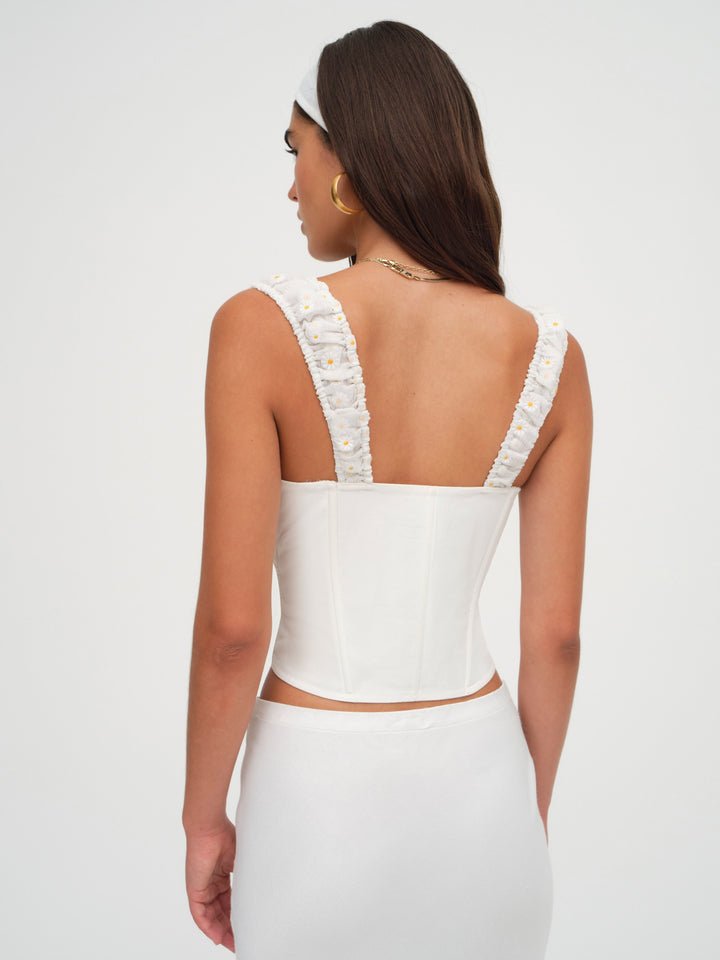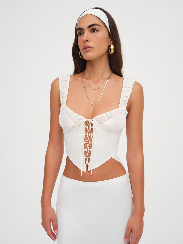 Look sweet as a daisy in the Tilly white bustier top—a denim corset top with functional lace-up detailing at the front, plus charming daisy-printed ruched chiffon across the neckline and shoulder straps.