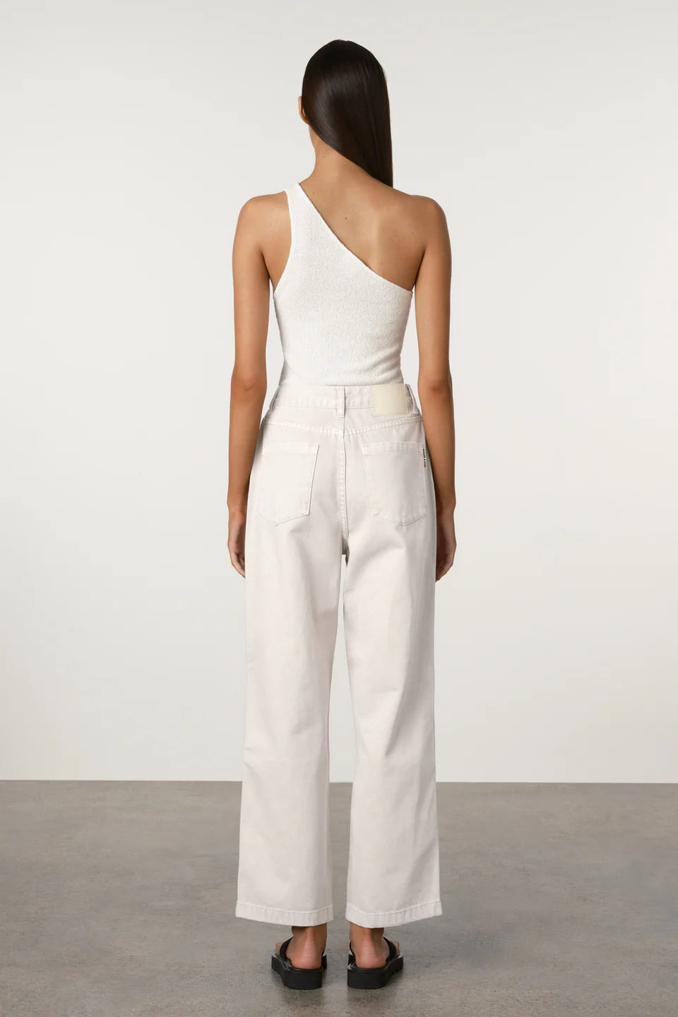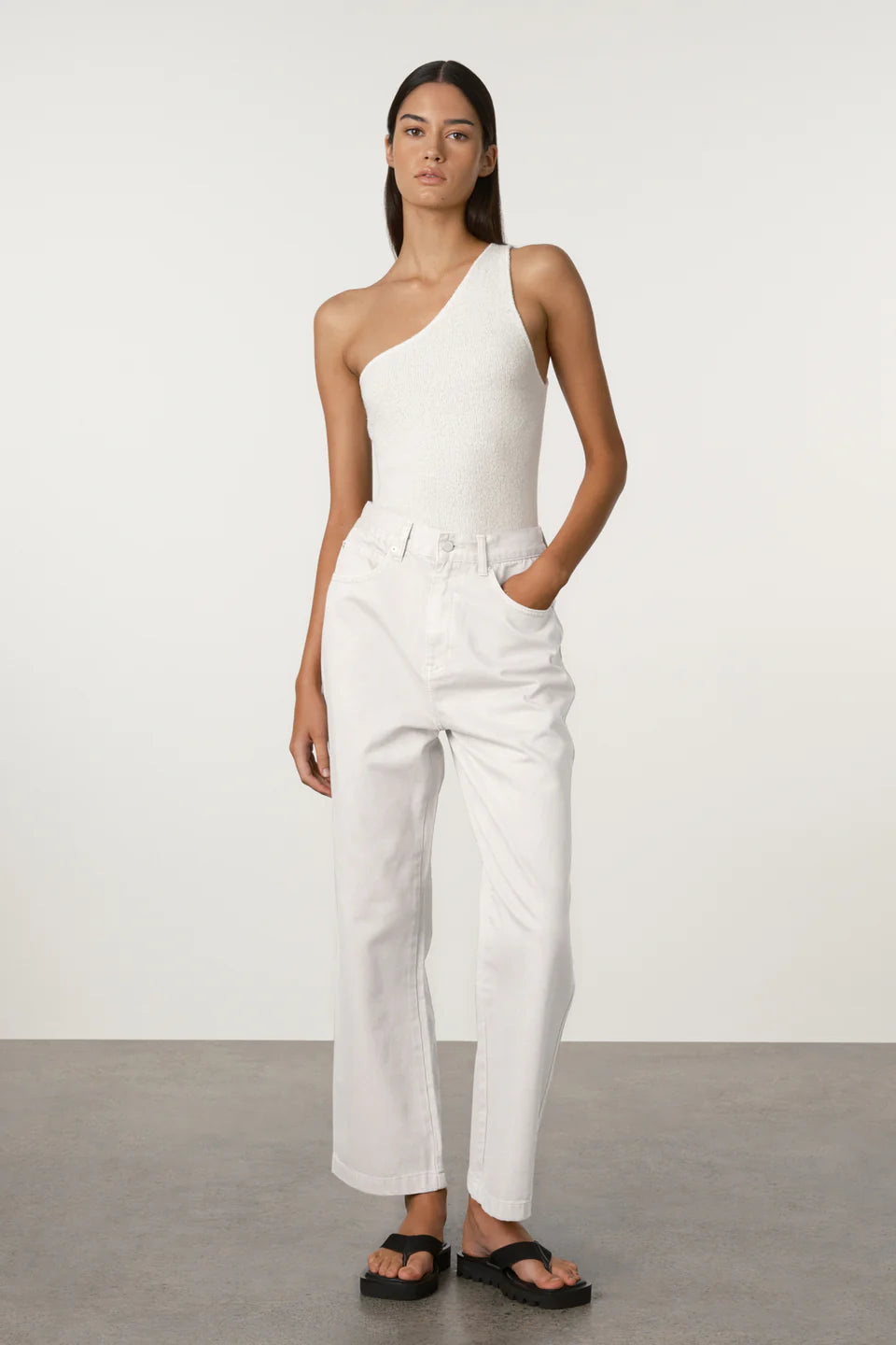 A modern take on a timeless classic, the mid-rise jean features a relaxed, straight-leg fit for effortless everyday wear. Crafted in fresh white denim, it’s designed with a traditional five-pocket construction, front fly zipper closure, and a fixed hem. Finished with branded brushed metal hardware and a vegan Jacron patch for a considered, elevated touch.