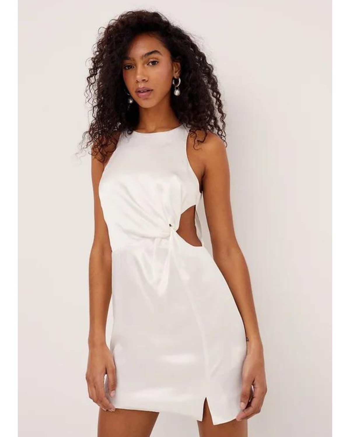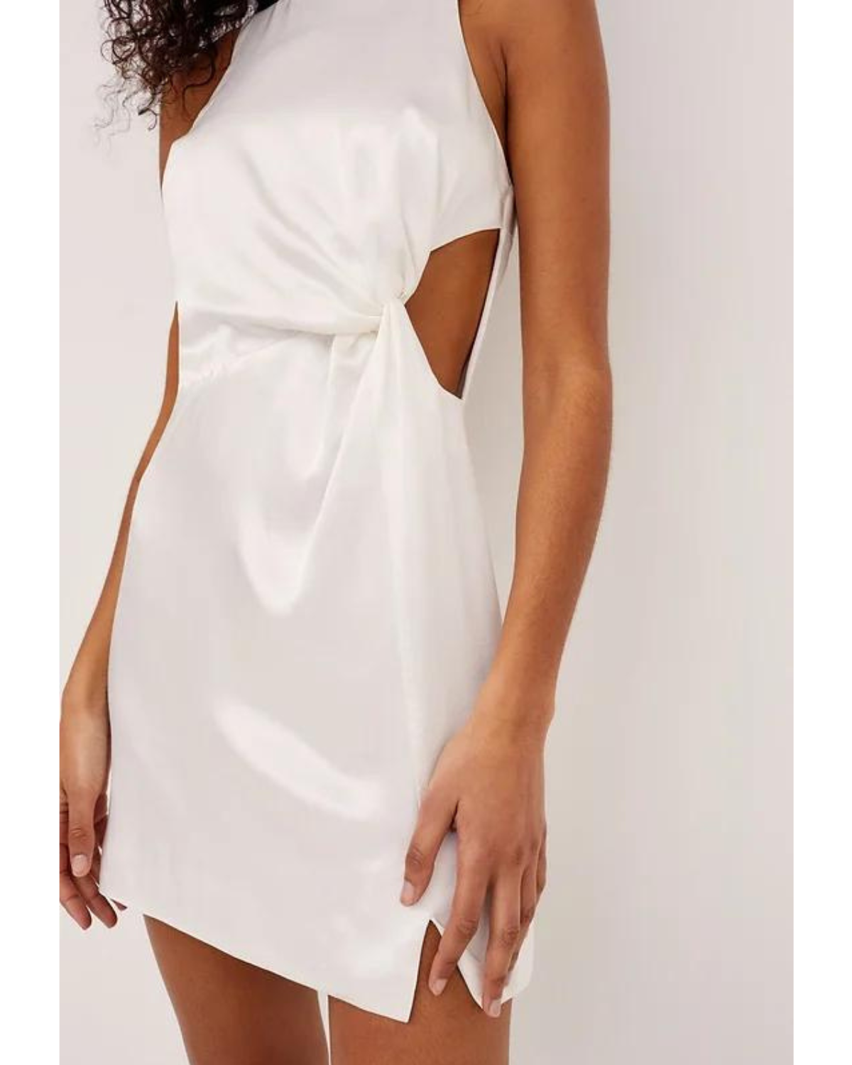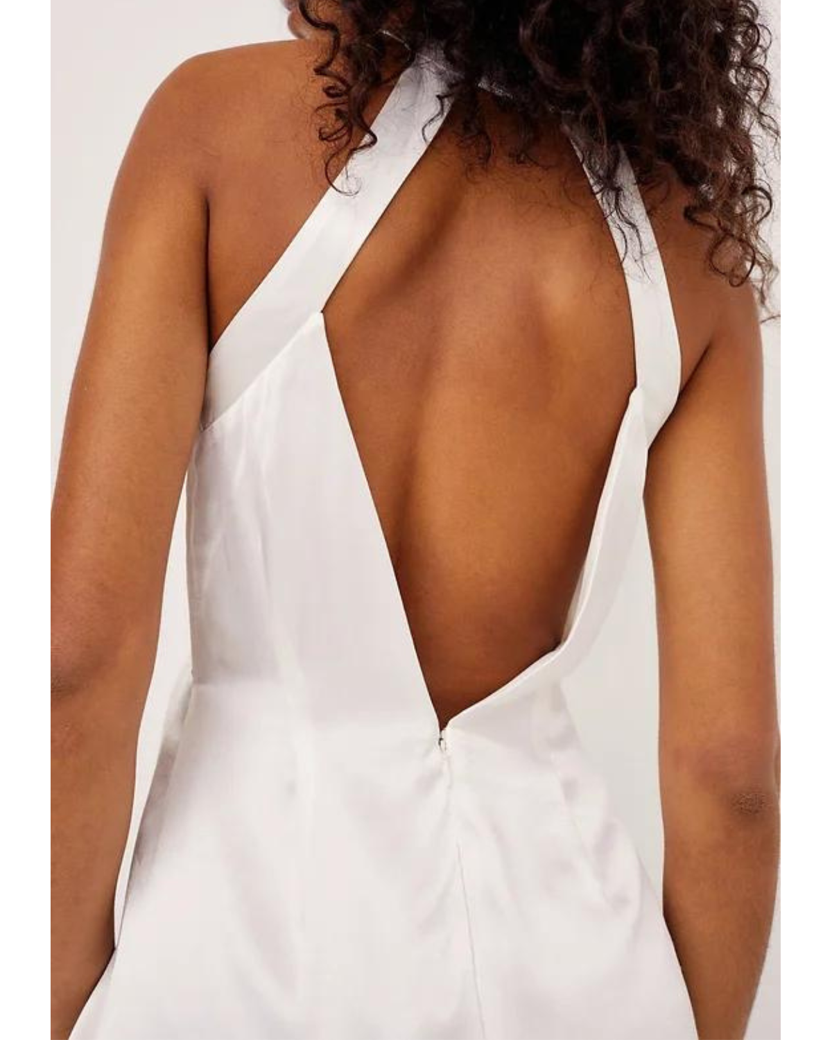 The perfect mix of sweet and sultry, this halter mini features a a side cutout with twist detail and mini thigh slit. Its slinky feel good fabrication is made from recycled materials. Made for the bride to be.