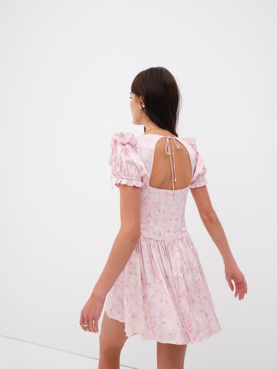 Feminine and fun featuring a retro floral print, the Paulina puff-sleeved mini is your spring time occasion piece. Complete with corset-inspired waist detailing and a plunge neckline.