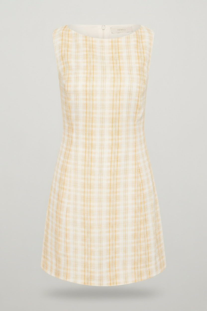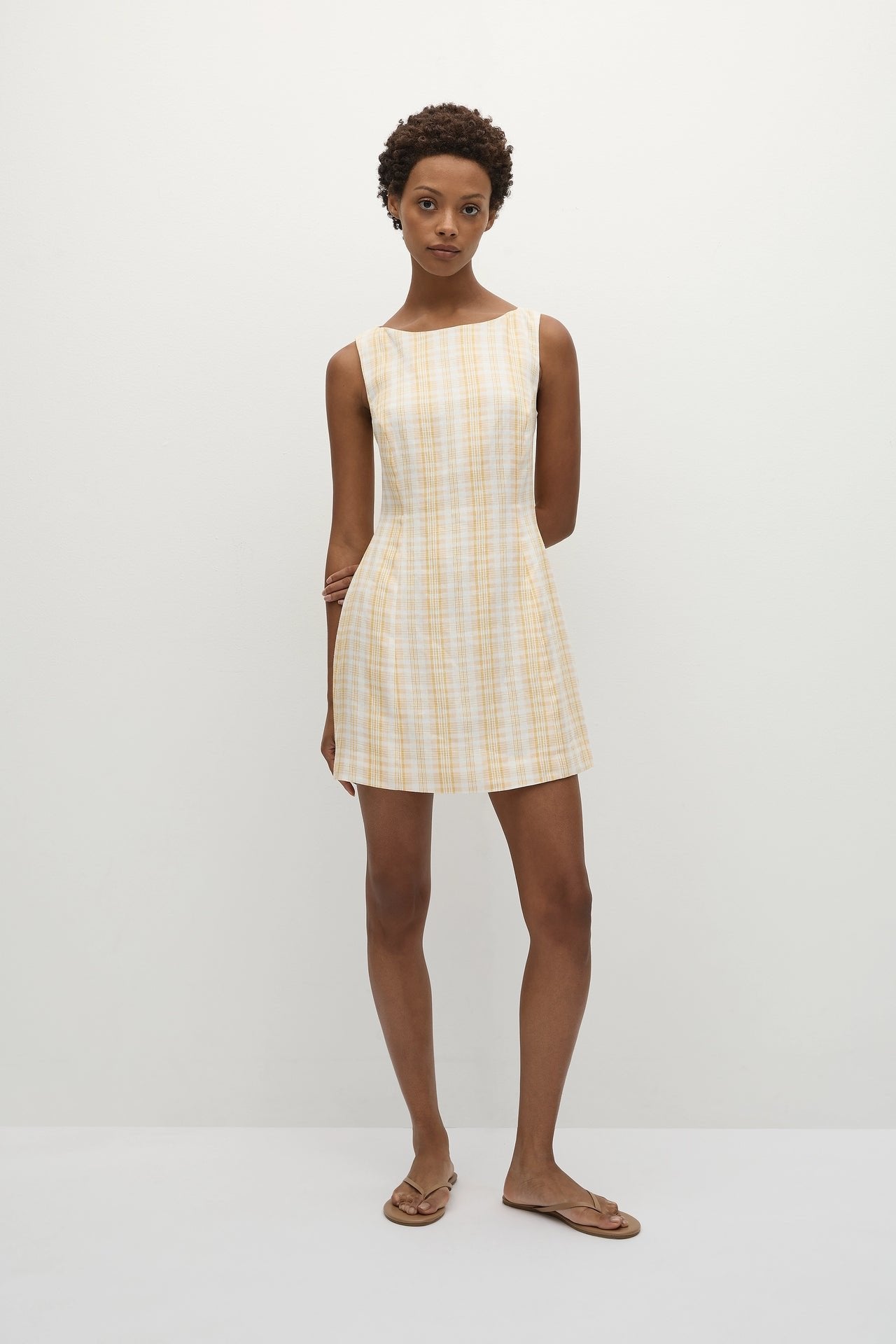 This retro-inspired sleeveless mini dress is softly fitted through the body with a smooth finish that falls into a slight A-line skirt, it is designed from a signature 100% European Flax linen fabrication in a nostalgic gingham print with creamy baby yellow tones. The perfect summer mini dress, style for days filled with sunshine.