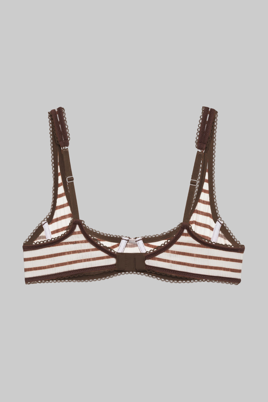 For a look that feels like home, the Bella unlined bra was designed for lounging, layering, and everything in between. Crafted in a brown and cream stripe, this underwire bra spotlights a contoured scooped cup shape and is adorned with scalloped picot trims and a rosette at front. Pair with the Bella Thong Panty for the complete lingerie set.