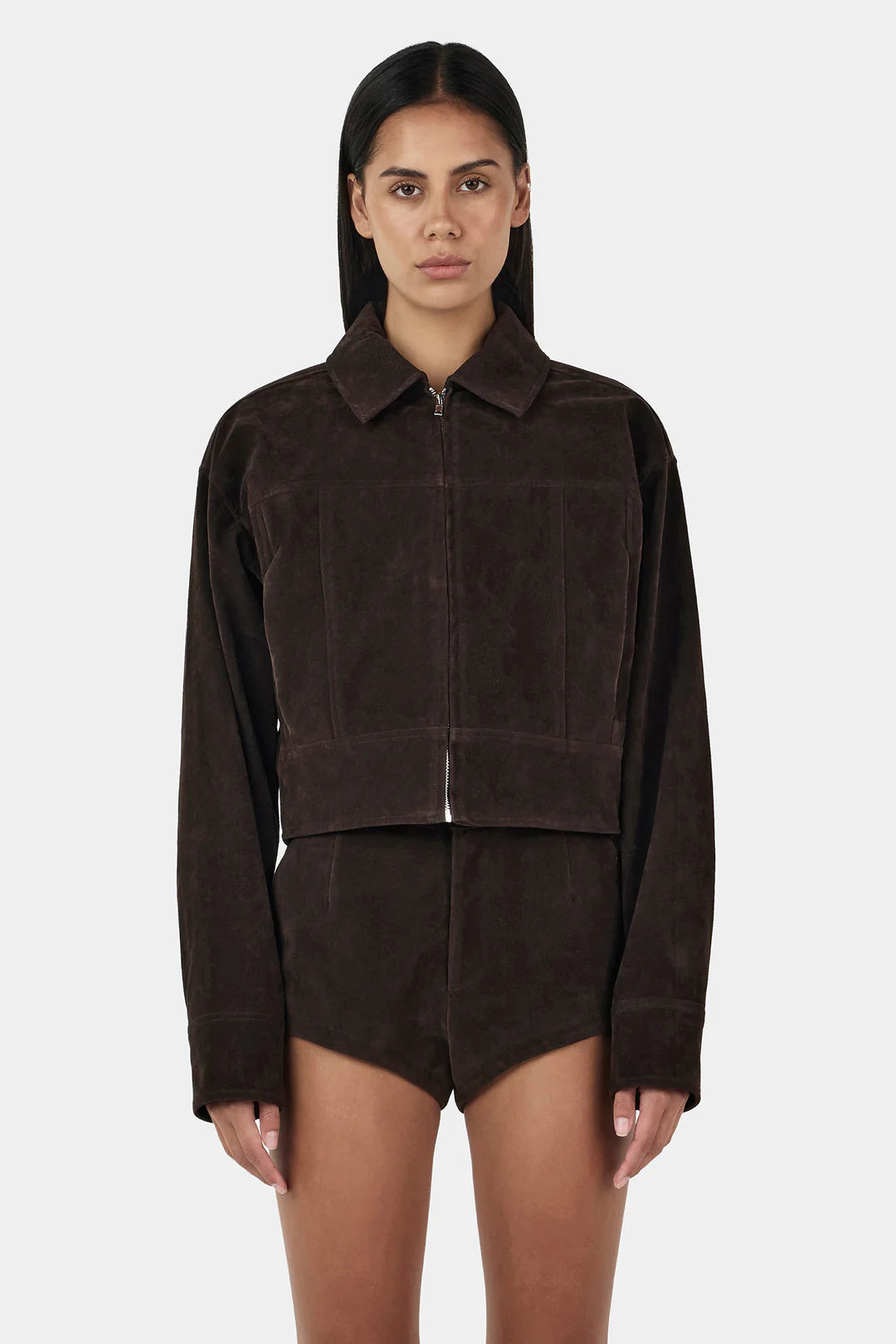 The Ownley Gina Bomber Jacket is crafted from structured suede that maintains a sharp silhouette. Expertly tailored, it features precise top stitch detailing and a fully lined interior, ensuring both style and comfort. This sophisticated bomber offers a refined yet durable option for elevated outerwear.