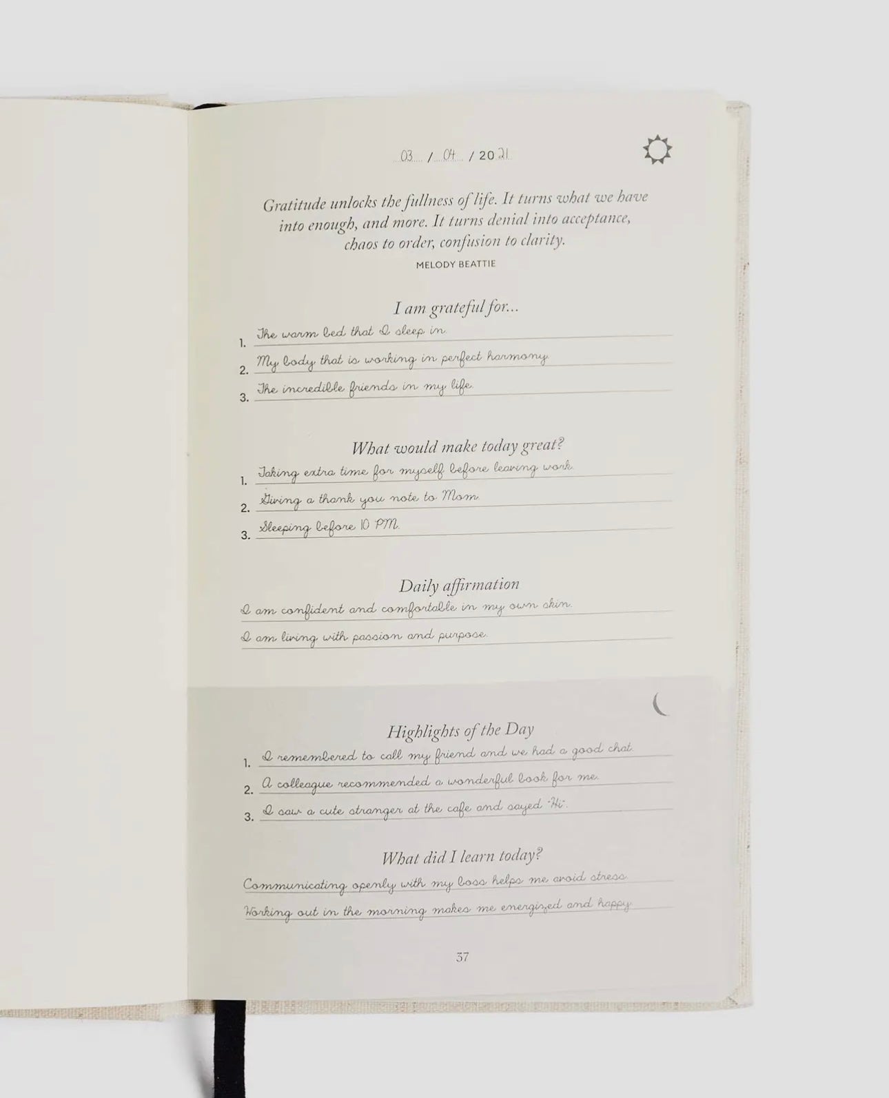 The original guided gratitude journal that's sold over 2 million copies. In just five minutes a day, it helps clear the mental clutter and shift focus to the good stuff. It's straightforward, no fuss, and like a toothbrush for your mind. Whether your schedule's packed, you're new to journaling, or you just never know what to say, this journal is here to help. Its prompts guide you through reflecting on the positive aspects of your day, making it a simple routine to boost your mood and overall happiness. Plus, it's designed to be as easy as possible, with a guided introduction that eases you into the habit and a clean, minimalist design that makes every page a pleasure to fill out.
