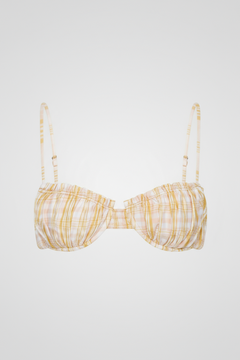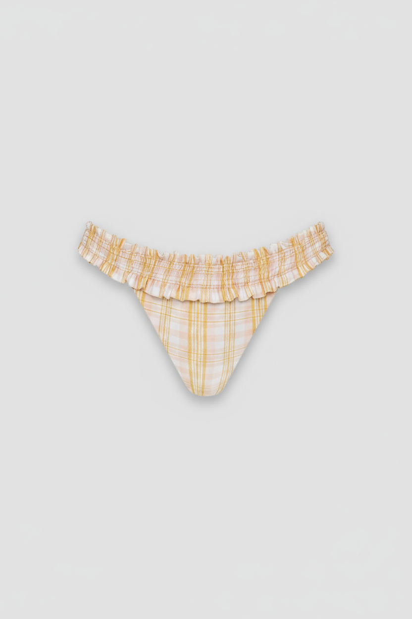 A medium-rise bikini bottom with a triangle shape silhouette and shirred frill detail along the waistband. Designed to be worn up on the hips for a cheekier fit, it is offered in a nostalgic gingham print with creamy baby yellow tones and can be styled with the matching Esterel Bikini Top for a vintage approach to vacation swimwear.