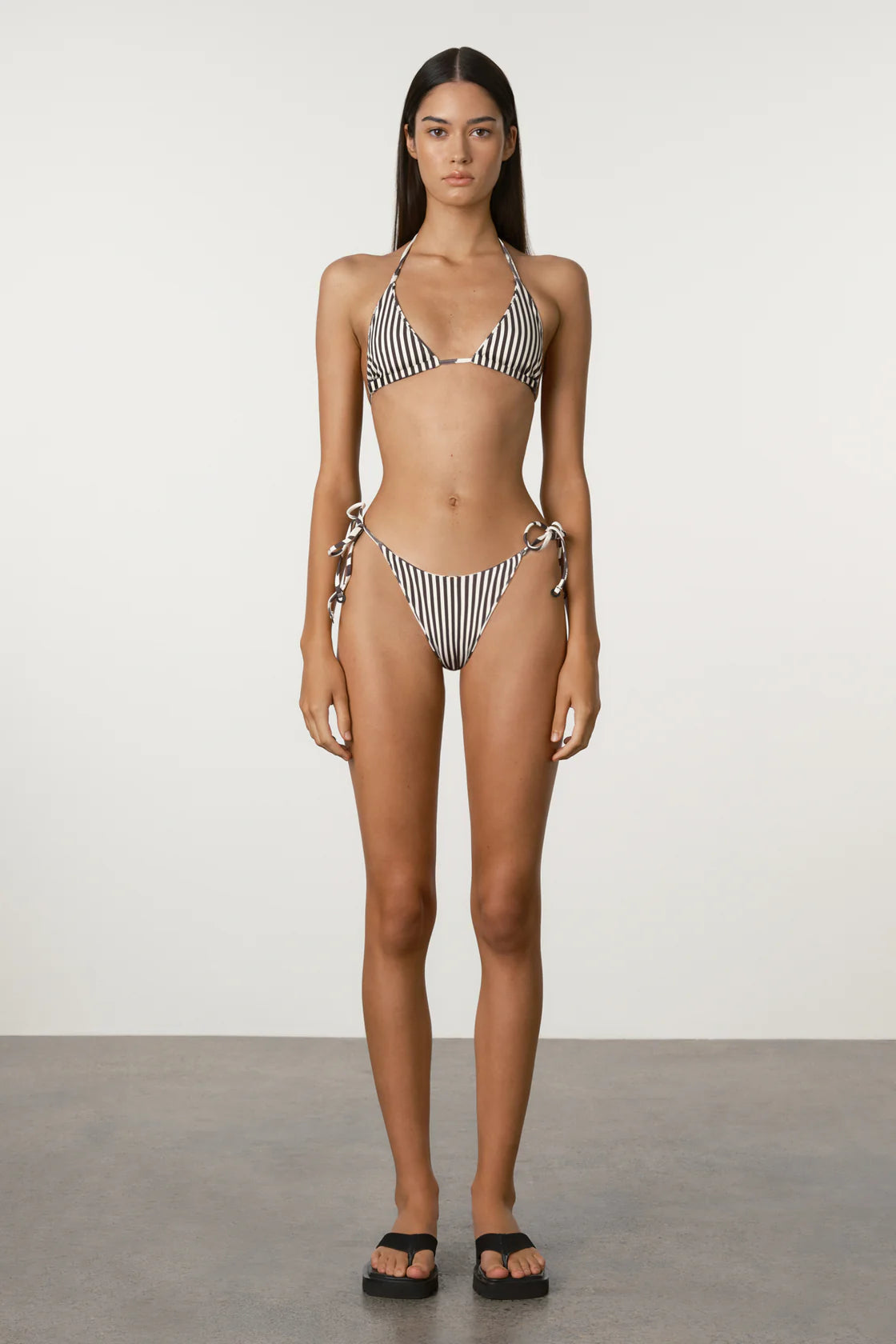 The Paint Flower Reversible Retro Tie Brief offers a versatile fit with a gently curved waistline that can be worn high or low on the hip, depending on your preference. This swimsuit can be worn two ways, one side showcases a hand-painted black floral print, while the reverse reveals a classic black pinstripe