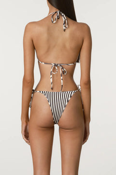 The Paint Flower Reversible Triangle features a soft triangle cup with adjustable ties. This versatile swimsuit can be worn two ways—one side showcases a hand-painted floral print, while the reverse reveals a classic black pinstripe.
