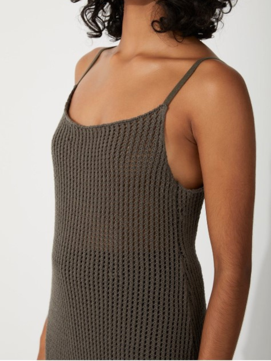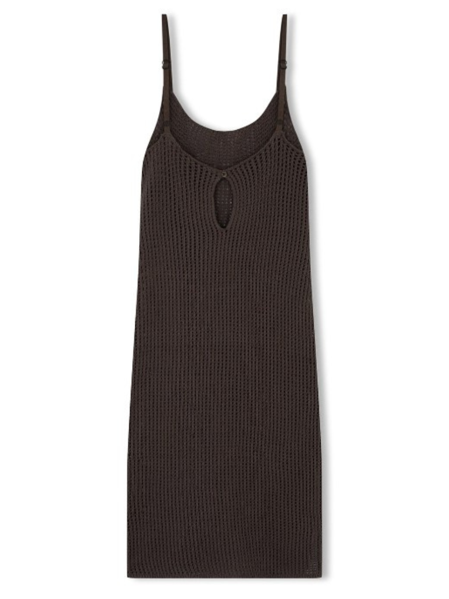 The Cotton Crochet Dress is a tactile sensation featured in an unlined dark grey custom crochet and offering a summery semi-sheer appearance. Layer this essential piece, or wear alone over swim.