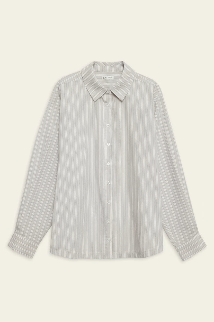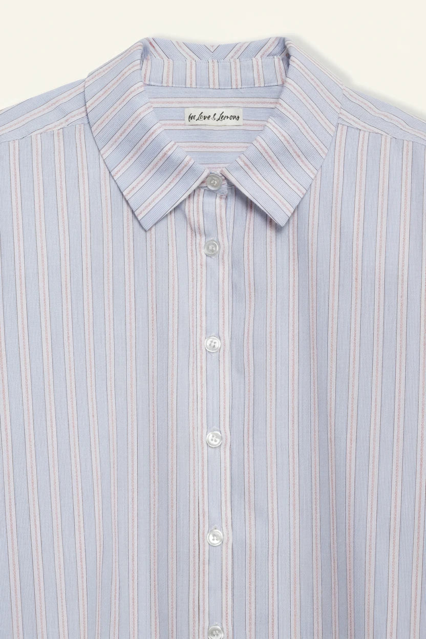 The For Love & Lemons Lakeside Stripe Button down in blue offers a refined, tailored fit with a classic striped pattern that elevates your wardrobe. Crafted to provide both style and comfort, its button-down design allows versatile layering for professional or casual settings.