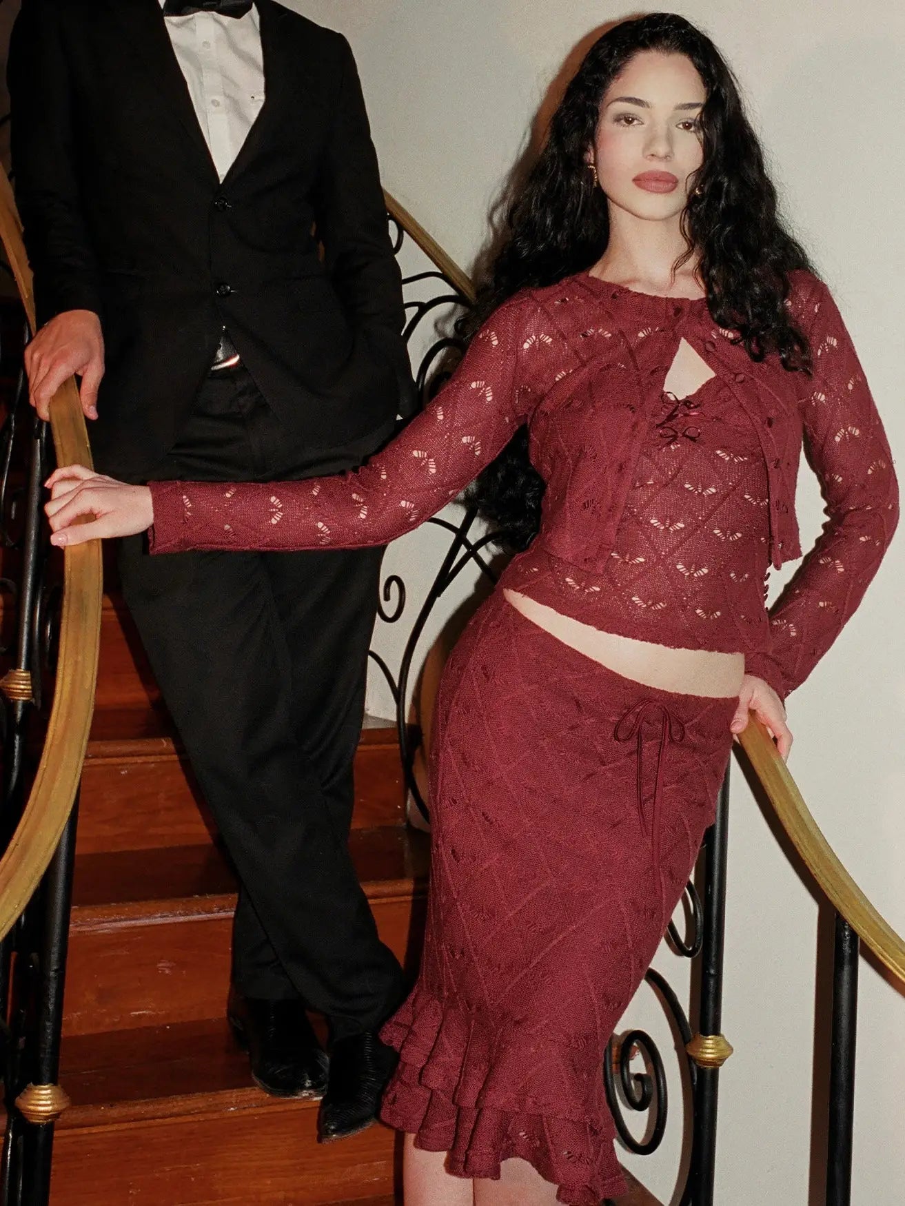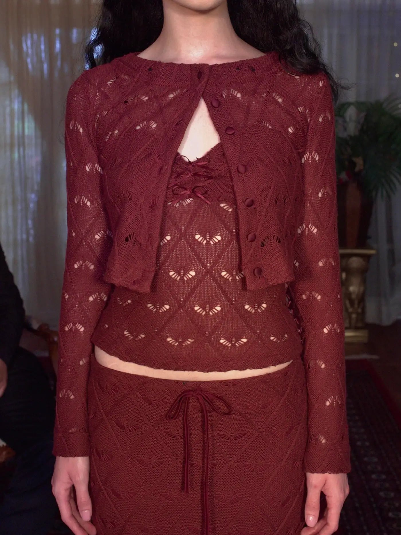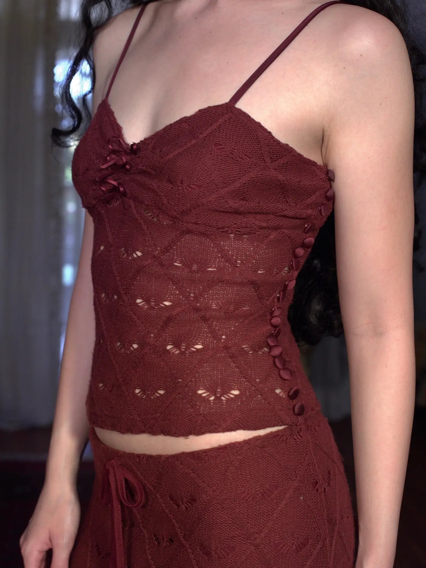 The Donna Camisole — crafted in a dark rose colored knit with a delicate babydoll fit that softly shapes the body. Effortlessly feminine and endlessly versatile. Made to pair back to the matching Valetta Midi skirt and Cardigan or a stand alone piece with your favorite denim.