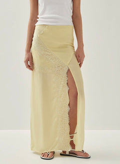 The Hebe top features a yellow hue, beautifully complemented by intricate matching lace detailing along the neckline, center, and hem. Featuring a relaxed silhouette and suitable for both casual and formal occasions, offering a refined aesthetic with thoughtful color and texture interplay. Style as a set with the Nusa Maxi Skirt.