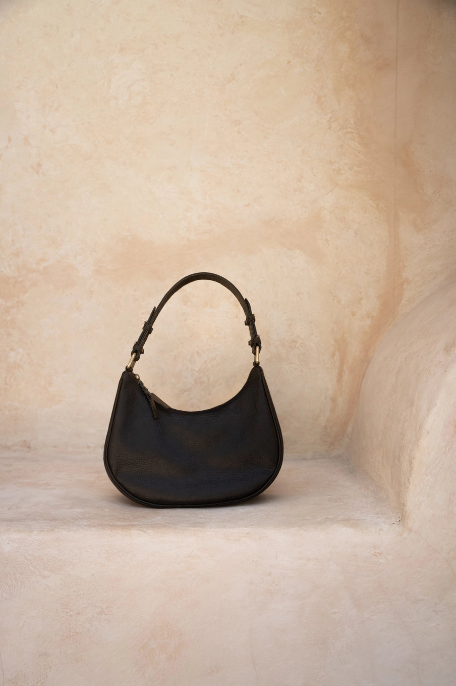 The Cara Mini Shoulder Bag blends effortless elegance with everyday versatility. Its compact crescent shape and adjustable strap make it ideal for day-to-night wear, while the vintage-inspired brass hardware and secure zip closure add both charm and function. Sleek and timeless, it's your go-to accessory for carrying essentials in style.