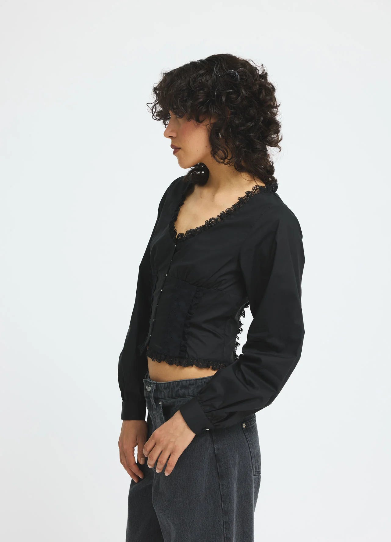 The DaphneRS Blouse is a sophisticated wardrobe essential. Crafted with attention to detail, this 100% cotton top features lace ruffle detailing and a hook and eye center. Pairing effortlessly with tailored trousers, skirts, or denim, making it a timeless style for those who appreciate quality basics.